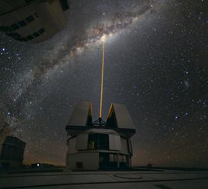 Mitte August 2010 schoss der ESO-Fotobotschafter Yuri Beletsky dieses Foto des Paranal-Observatoriums der ESO. Eine Gruppe von Astronomen beobachtete das Zentrum der Milchstraße unter Verwendung der Vorrichtung zur Erzeugung eines künstlichen Leitsterns mit dem Yepun-Teleskop, einem der vier Unit-Teleskope des Very Large Telescope (VLT). Yepuns Laserstrahl durchquert den südlichen Himmel und erzeugt einen künstlichen Stern in 90 km Höhe in der Mesosphäre der Erde. Der Laser-Leitstern (LGS) ist ein Teil der adaptiven Optik des VLT und wird als Referenz zur Korrektur der durch die Atmosphäre verursachten Unschärfe-Effekte auf Aufnahmen verwendet. Die Farbe des Lasers ist exakt abgestimmt, um eine Schicht von Natrium-Atomen anzuregen, die sich in einer der oberen Schichten der Atmosphäre befindet - die bekannte Farbe der Natrium-Lampen der Straßenbeleuchtung lässt sich in der Farbe des Lasers wiedererkennen. Vermutlich ist diese Schicht von Natrium-Atomen ein Überrest von Meteoriten, die in die Erdatmosphäre eintreten. Wenn sie durch das Licht des Lasers angeregt werden, beginnen die Atome zu leuchten und bilden so einen kleinen hellen Fleck, der als künstlicher Referenzstern für die adaptive Optik benutzt werden kann. Mittels dieser Technik können Astronomen schärfere Beobachtungsergebnisse erhalten. Beispielsweise können Forscher bei der Beobachtung des Zentrums unserer Milchstraße besser den galaktischen Kern überwachen. In diesem verschluckt ein supermassereiches schwarzes Loch Gas und Staub, während es von nahen Sternen umkreist wird. Das Foto wurde mit einem Weitwinkelobjektiv aufgenommen und deckt mit etwa 180° beinahe den gesamten sichbaren Himmel ab.