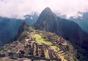 Klassicher Blick auf Machu Picchu: Links vom Zentralen Platz liegt der obere Stadtbereich mit vielen der wichtigsten Gebäude und dem Intihuatana Stein.