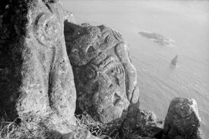 Petroglyphen bei Orongo im Südwesten. Ausblick auf die Felsen Motu Nui, Motu Iti und Motu Kao Kao