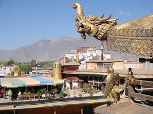 Potala Palast in Lhasa, Panorama, mit Drachenköpfen im Vordergrund